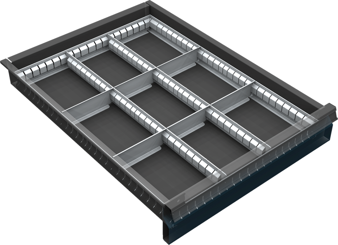 Plechové dělení rozděluje zásuvku na 9 oddělení.