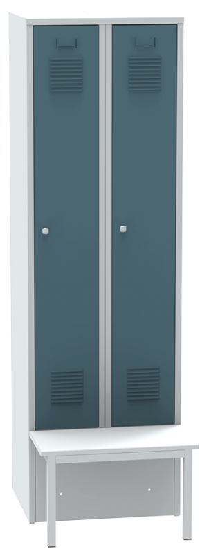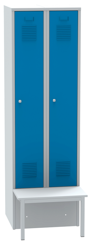 Dvoudvéřová kovová šatní skříň s předsazenou lavicí